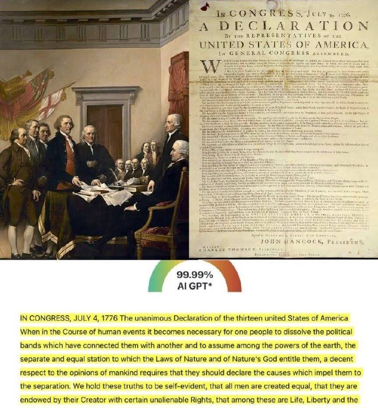 An AI detector just flagged the 1776 Declaration of Independence as 99.99% ai-written.