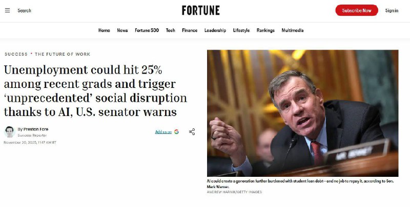 Unemployment among recent U.S. college graduates could spike to 25% within a few years due to AI-driven job displacement, warns Senator Mark Warner, who says this shock could trigger “unprecedented” social disruption if policymakers fail to act.