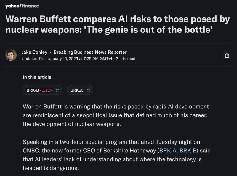 ❗️Warren Buffett warns that the risks of rapid AI development resemble the development of nuclear weapons.