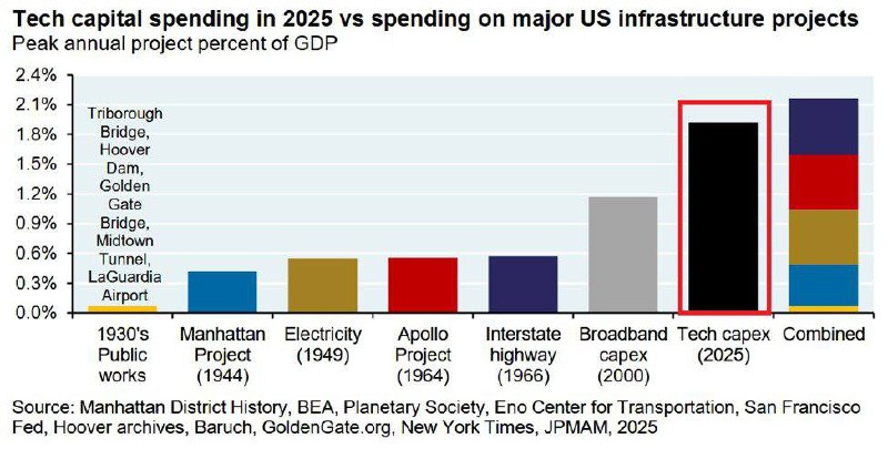 In 2025, tech CapEx as a % of GDP nearly matched the COMBINED scale of the largest capital projects of the 20th century. This comes as Big Tech CapEx rose to 1.9% of GDP last year.