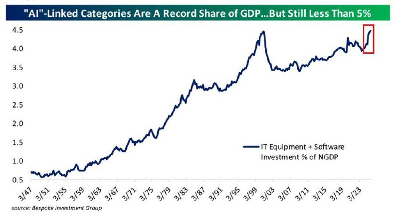 IT equipment and software investment now reflects a record 4.5% of GDP. This surpasses the previous peak seen in Q4 2000, now up +1.5 percentage points since Q3 2023.