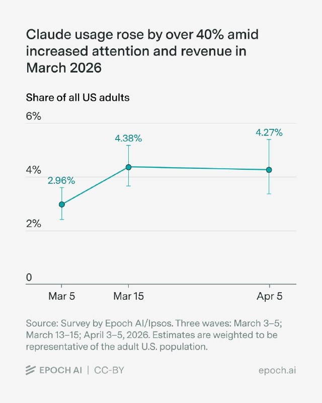 Claude usage among U.S. adults jumped by over 40% in the last month, rising from a 3.0% share in early March to 4.3% in early April 2026.
