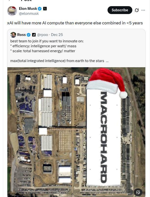 🗣 Elon Musk said xAI will surpass everyone else in AI compute within 5 years, with the Macrohard-branded Colossus 2 data center serving as a clear reference to his AI project aimed at rivaling Microsoft.
