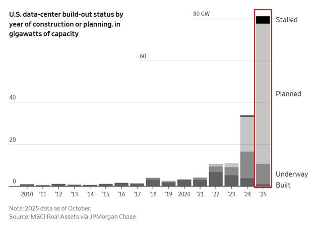 Data center capacity that is built, under construction, or in planning hit a record ~80 gigawatts in 2025. To put this into perspective, this much capacity could theoretically power up to 60 MILLION homes.