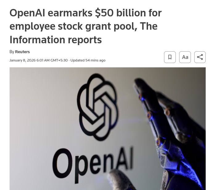 OpenAI reportedly set aside an employee stock grant pool worth $50B during fall 2025. An employee grant pool is a reserved slice of ownership used for future options or restricted stock, so its dollar value rises and falls with valuation.
