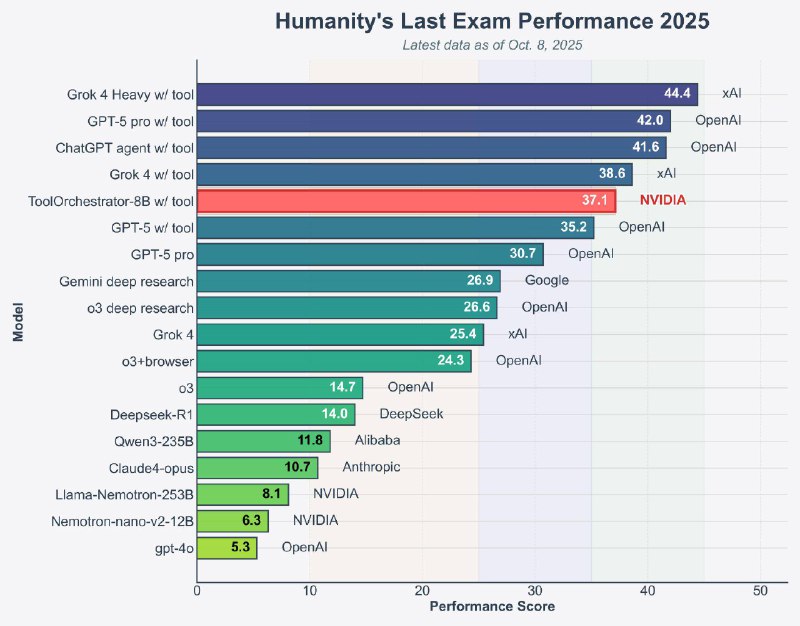 NVIDIA released Orchestrator-8B, a tiny routing model that decides when to answer itself and when to call tools like search, code, APIs, or bigger LLMs. And it’s shockingly good: 37.1% on Humanity’s Last Exam vs GPT-5’s 35.1%, while being ~2.5× more efficient.