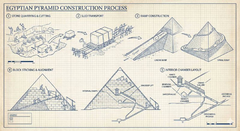 “Blueprint style diagram showing how the Egyptian pyramids were made. Multiple labeled steps: stone quarrying, sled transport, ramp construction, block stacking, interior chamber layout. Cross sections, arrows, minimal color, archaeological accuracy, clean vector lines.”